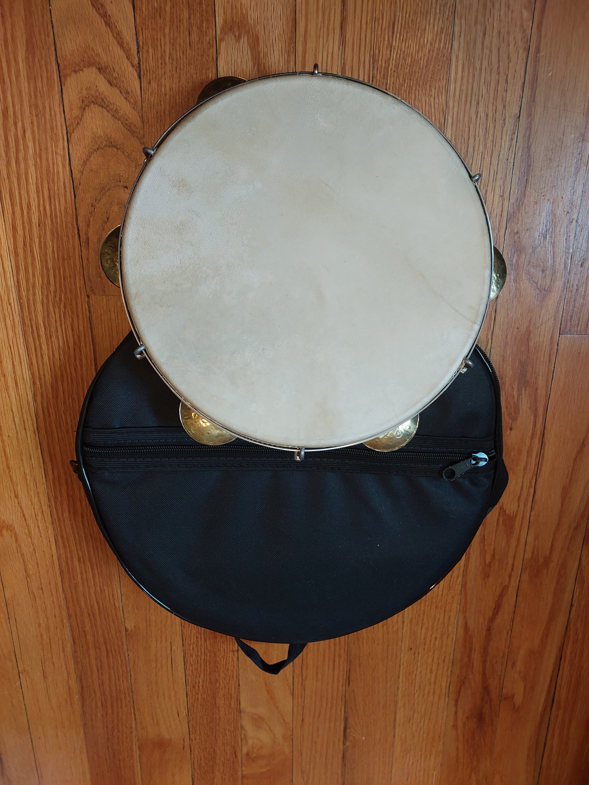 2025 (new) pandeiro by Dyorman for choro and samba. Imbuia wood rim, goat skin leather head, metal hardware & simple black gig bag. Based in Minas Gerais, Dyorman makes perhaps the most popular pandeiro in Brazil today for use in rodas de choro. The pandeiro is extremely light-weight and easy to get a great sound. This pandeiro comes with their stamped brass jingles (platinelas) — these platinelas have great sizzle and are well-behaved, like a well-tuned drumset high-hat. This a great pandeiro for the beginner or professional pandeiro player.