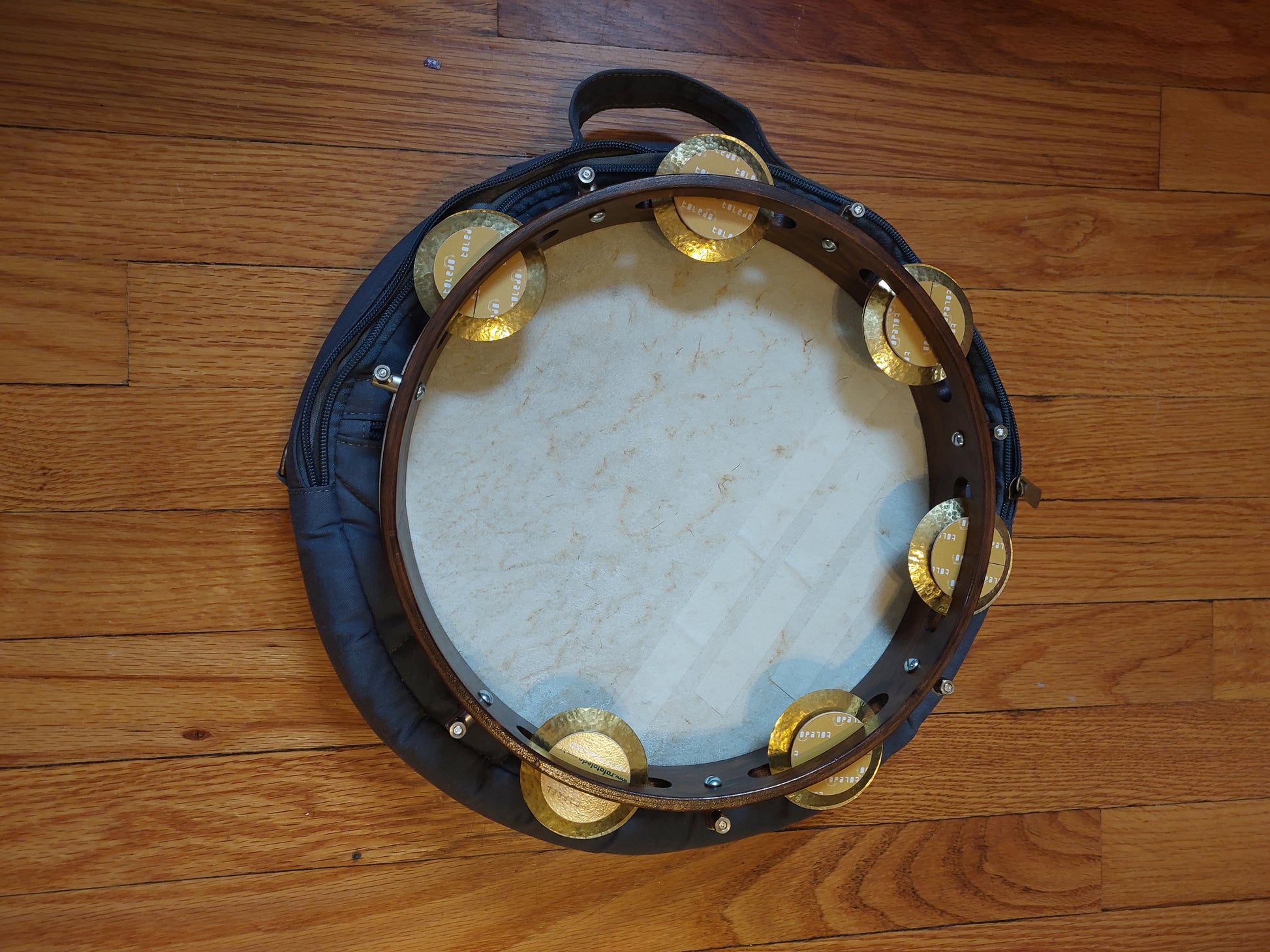 2024/2025 (new) pandeiro by Rafael Toledo for choro and samba. Imbuia wood rim, goat skin leather head, handmade hardware & hand-sewn gig bag. Rafael is the most in-demand maker of pandeiros in Brazil today, as well as a top percussionist.