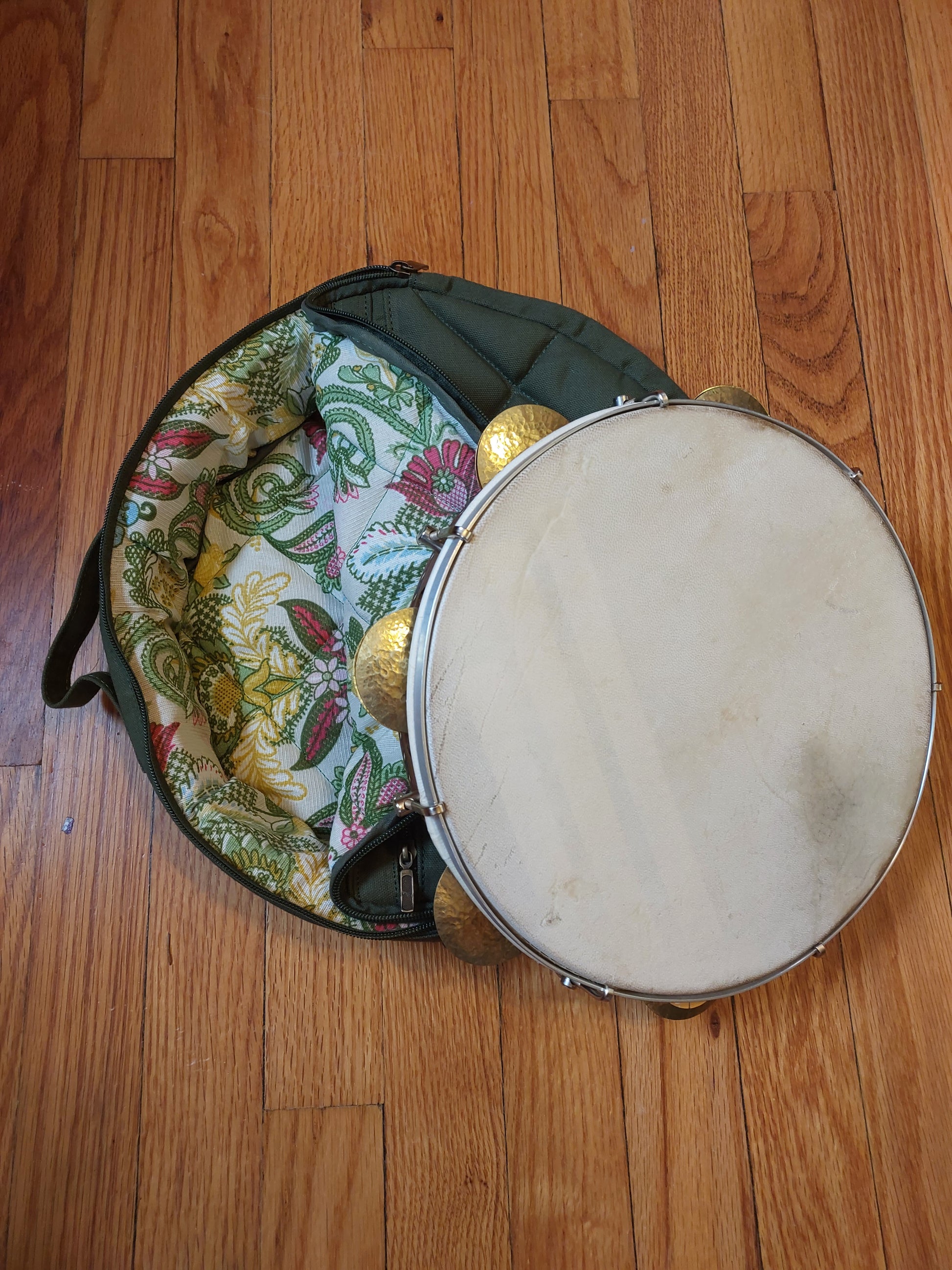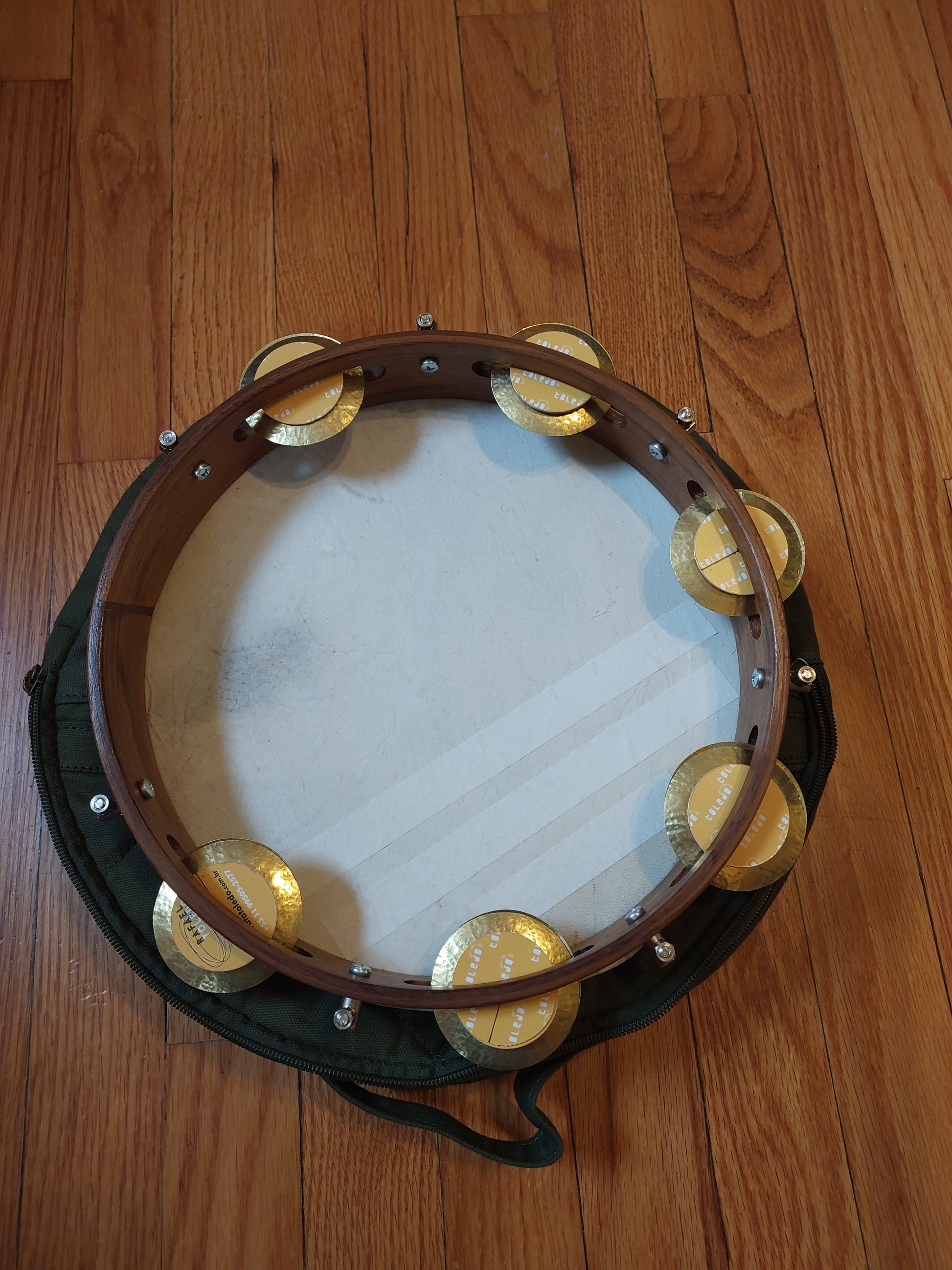 2024/2025 (new) pandeiro by Rafael Toledo for choro and samba. Imbuia wood rim, goat skin leather head, handmade hardware & hand-sewn gig bag. Rafael is the most in-demand maker of pandeiros in Brazil today, as well as a top percussionist.